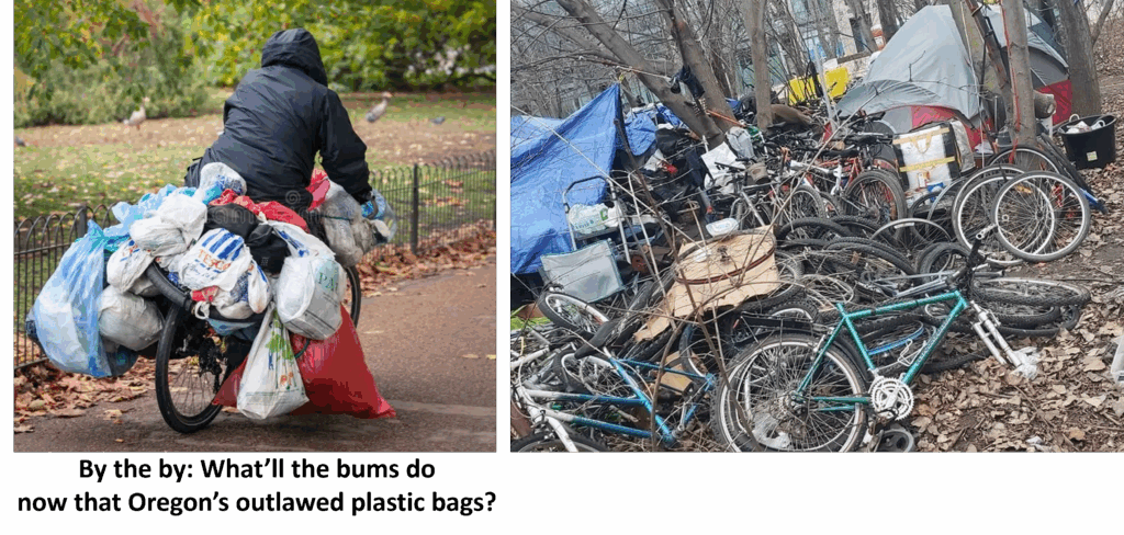 Summer a prime time for bike thefts in Eugene. And guess who’s stealin’ all those bikes and bike parts? It sure as hell ain’t the college kids. They’re the ones who’re losin’ ’em to thieves. Think about it. Bums don’t have two nickels to rub together, yet you see plenty of ’em ridin’ bikes pullin’ little carts fulla junk – including bike wheels – strapped to the top. TRANSITION CENTERS!!!